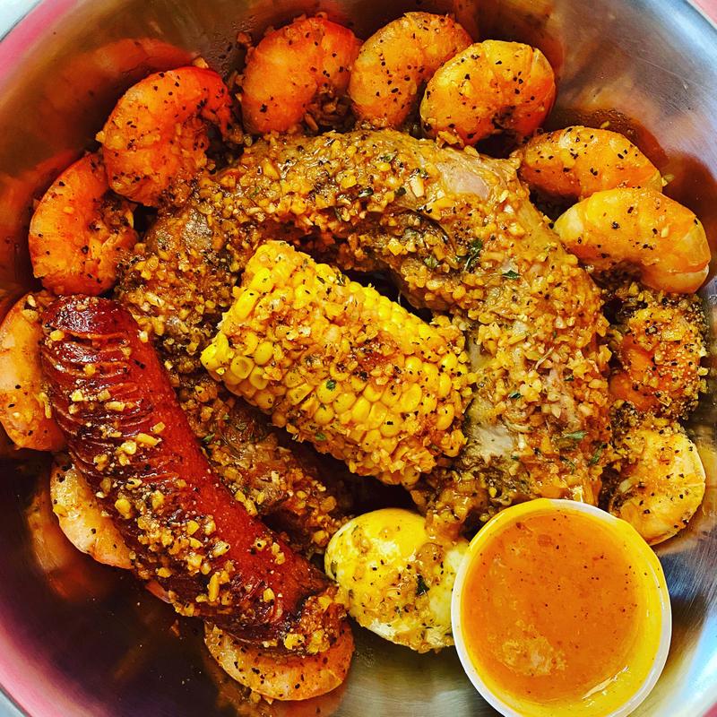 1/2lb. Snow Crab, 1/2lb. Shrimp, 2 Corn, 2 Potatoes, 1 Drip Sauce